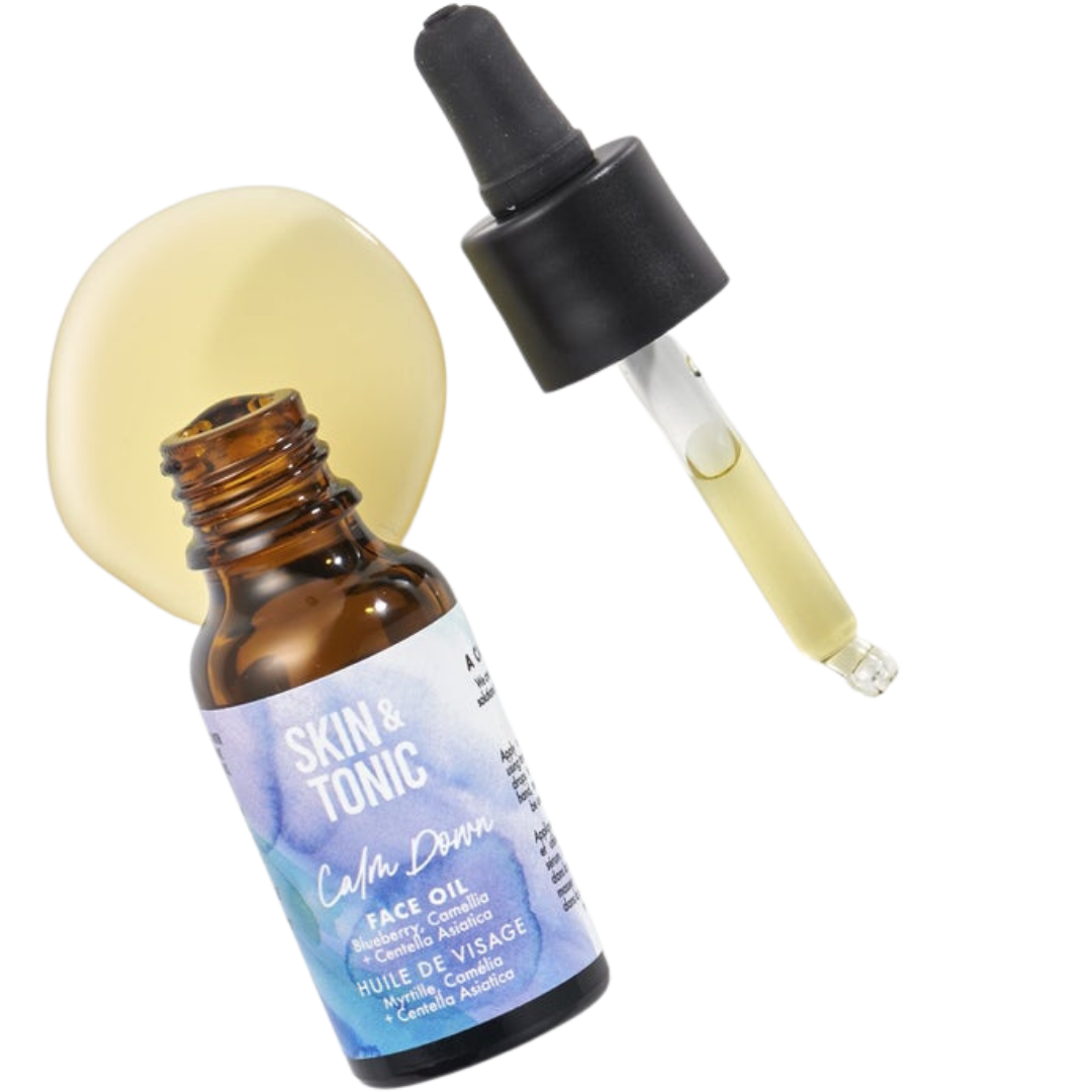 Show your stressed-out skin some love with Skin & Tonic's Calm Down Face Oil. Comforting and lightweight, Calm Down your skin with centella asiatica while using antioxidant-rich, upcycled blueberry oil to fight blue light damage.